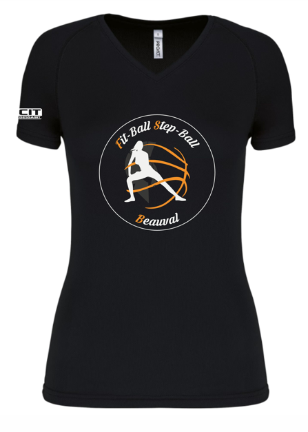 Encolure en V en bord-côte avec élasthanne. Bande de propreté ton sur ton à l'encolure.